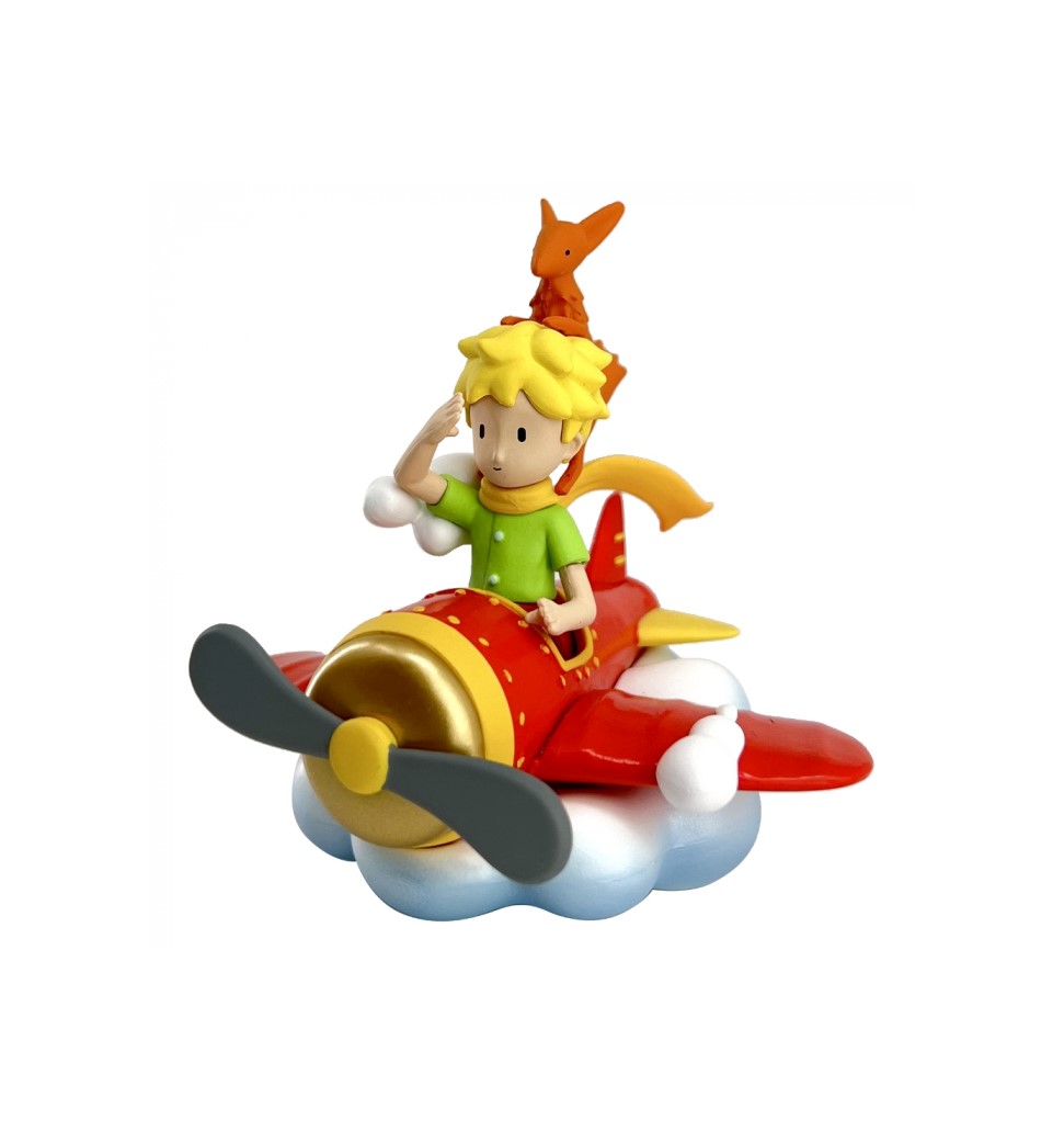 Ο Μικρός Πρίγκιπας με την αλεπού του και τα μαλλιά του στον άνεμο, πιλοτάρει το διάσημο αεροπλάνο του.